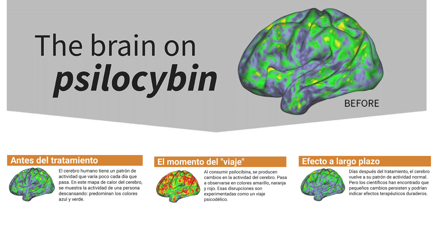 Uno de los efectos más importantes es que se reduce la actividad de la Red Neuronal por Defecto, que es como el "piloto automático" de tu cerebro, asociada al ego y patrones habituales de pensamiento. Esto genera una sensación de disolución del ego y unidad con todo lo que te rodea.