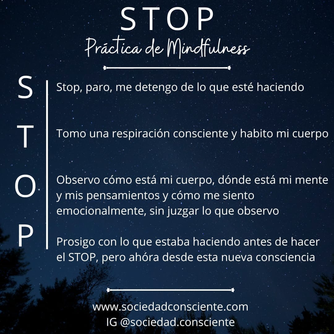 Entonces, cada vez que suene, recuerdas la palabra STOP y sigues las instrucciones de la imagen. Este ejercicio te sirve para traer tu atención y consciencia al presente y desactivar el modo piloto automático de nuestro cerebro. Mientras más veces lo haces, más presente te sentirás.