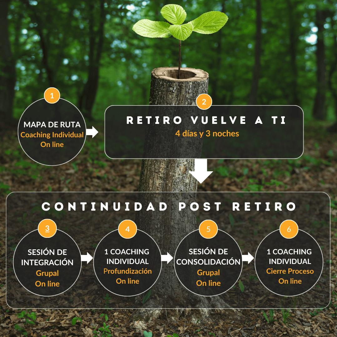 Nuestro Programa integra 1 Retiro de 4 días y 3 noches, 3 sesiones de coaching individual online y 2 sesiones de coaching grupal online junto a tus compañer@s del Retiro. Te mostramos el detalle de cada etapa a continuación: